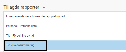 Välj en rapport i listan. Du kan välja alla rapporter som finns tillgängliga under Menyn Rapporter, dvs både standardrapporter och rapporter från Rapportgeneratorn.