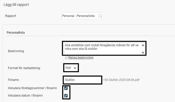 Ange ev beskrivning för att förtydliga vad rapporten är inställd att göra och välj i vilket format rapporten ska laddas ned i. Ange även önskat filnamn i avsett fält för detta och om företagets nummer och datum ska inkluderas i filnamnet.