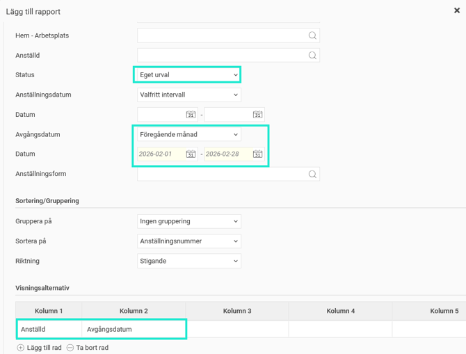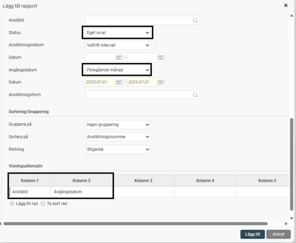 Gör de urval (=filter) du vill ska tillämpas på denna rapport. I exemplet nedan vill vi lägga till en rapport av typen Personallista med urval på alla anställda som slutat föregående månad för att se vilka som ska få slutlön. Vi har valt att visa två kolumner, Anställd och Avgångsdatum.