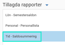 Välj en rapport i listan. Du kan välja alla rapporter som finns tillgängliga under menyn Rapporter, dvs både standardrapporter och rapporter från Rapportgeneratorn. Du kan använda sökfältet för att söka på ett rapportnamn eller en rapportkategori.
