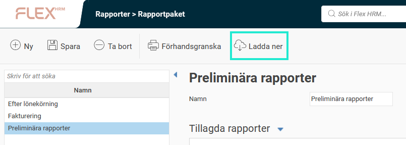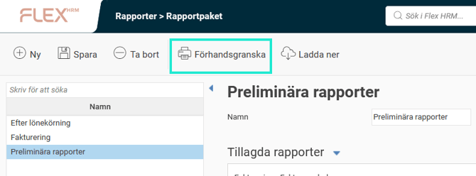 Ett rapportpaket är ett sätt att välja flera rapporter med förinställda urval som ska dras samtidigt i Flex HRM. Det finns möjlighet att sätta upp valfritt antal rapportpaket och alla som har behörighet till modulen kan använda de skapade paketen.
