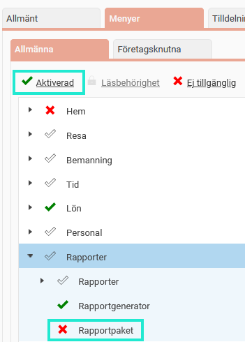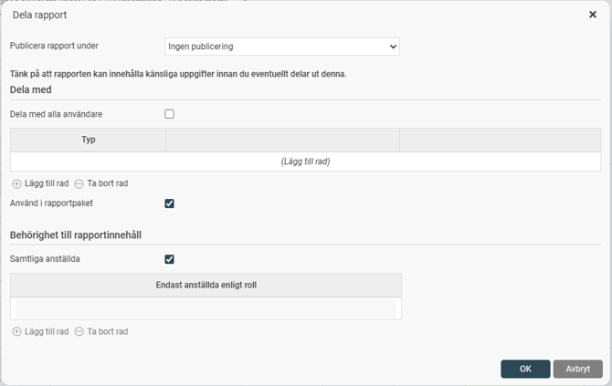 Observera att om en användare får behörighet till Rapportpaket kan de se och ta ut alla rapporter som skapats och delats i rapportgeneratorn.