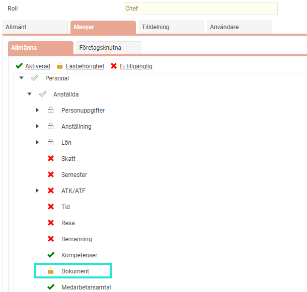 - Ställ in så att rollen som ska se anställdas dokument har läsbehörighet till ikonen Dokument. Nedan exempel visar rollen Chef.