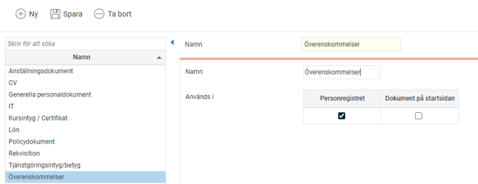 Du hanterar dokumentkategorierna via menyn Administration > Inställningar > Personal > Dokumentkategorier.