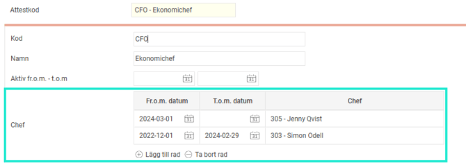 När du har aktiverat inställningen för konteringsdimensionen enligt beskrivningen ovan, aktiveras en lista i registret. I den listan anger du vem som är aktuell chef för respektive kod.
