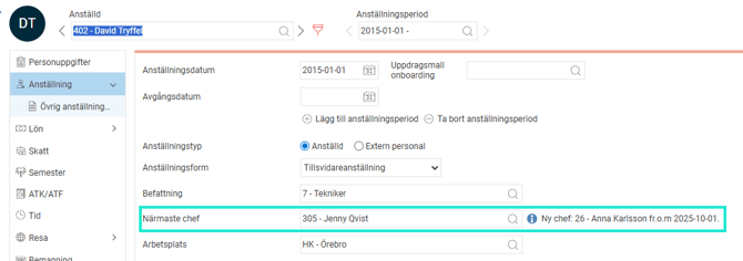 Detta gör att du enkelt och i god tid kan förbereda ett chefsbyte. Den nya chefen blir automatiskt synlig för de anställda från och med det datum som chefsbytet sker enligt registret. Om det finns flera kommande chefer i listan, visas endast den nuvarande och den närmast kommande chefen för den anställde.