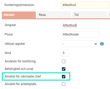 För att kunna använda funktionen behöver du först bestämma vilken av era konteringsdimensioner som ska användas för "Närmaste chef." Konteringsdimensionen kan heta vad som helst, vanliga exempel är "Närmaste chef" eller "Attestkod".