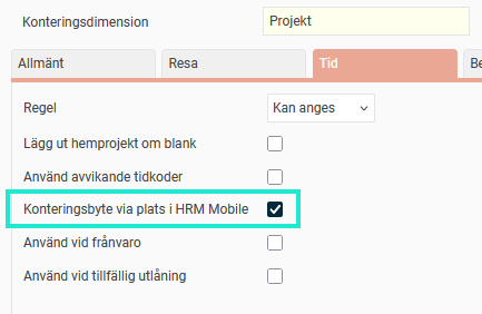 Funktionen aktiveras per konteringsdimension under Inställningar > Allmänt > Konteringsdimensioner > Fliken Tid: Konteringsbyte via plats i HRM Mobile.