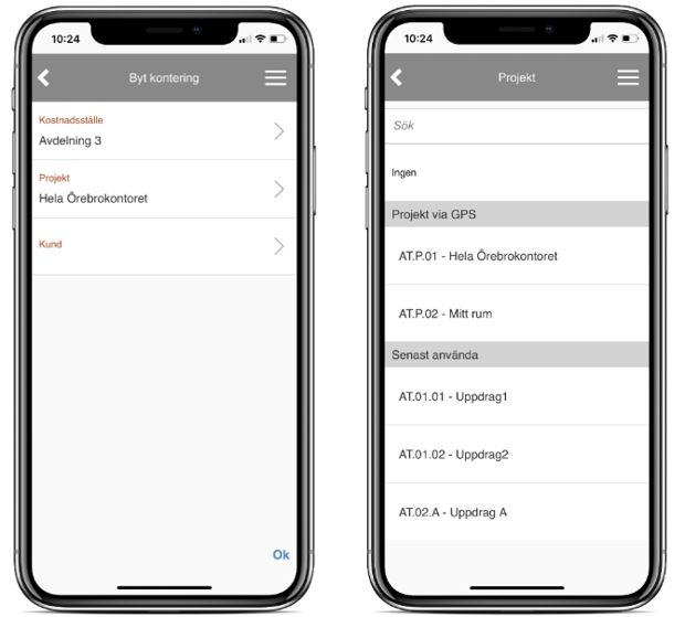 När du stämplar in/konteringsbyte i HRM Mobile och din aktuella plats matchar ett projekt kommer det projektet automatiskt att väljas. Skulle din aktuella plats matcha flera projekt kommer de att visas som förslag när du väljer projekt (bilden till höger nedan).