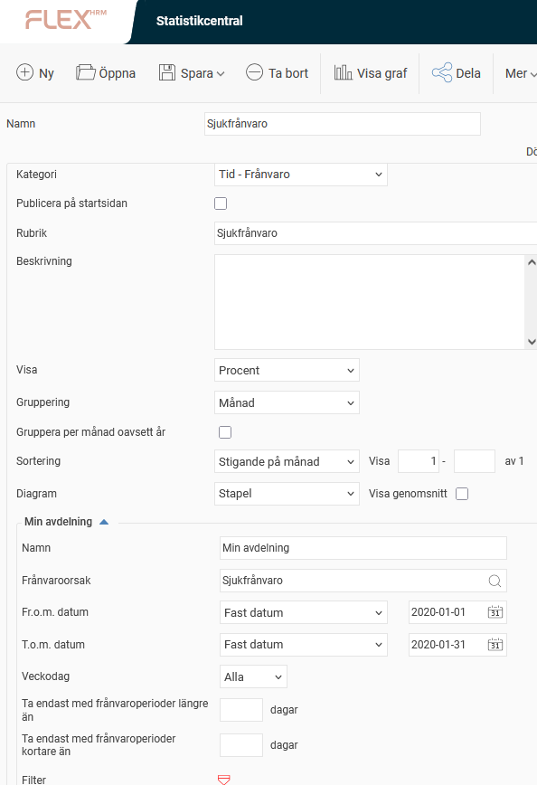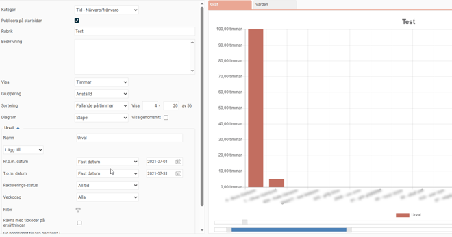 Sedan klickar du på Visa graf, så kommer HRM att beräkna frånvaron samt visa en graf till höger enligt de urval du gjort.
