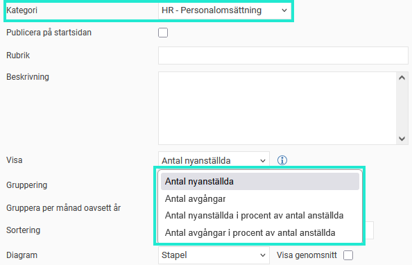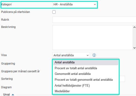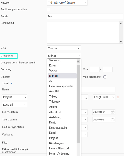 Du kan gruppera dessa statistikuppgifter för att enkelt få en intressant statistik. Följande kan du gruppera på: Vecka, Månad, Kvartal, År. Gruppering på olika tidsintervall kan vara användbart då man vill se hur till exempel antal anställda har förändrats över tid.