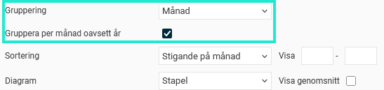 Väljer du att gruppera statistiken per månad eller per vecka kan du välja om du vill gruppera per månad eller vecka oavsett år. Det betyder att om du tar ut statistik för flera år så kommer den att grupperas per månad eller vecka så att samma månad eller vecka under respektive år grupperas ihop.
