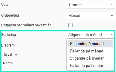 Sortering kan göras antingen på den enhet som är vald under visning eller på grupperingsalternativet. Sorteringen kan göras stigande eller fallande. Om du till exempel väljer att ta ut statistik på närvaro och väljer att visa procent av schematid och gruppera per månad kommer du att få följande fyra sorteringsalternativ: stigande på månad, fallande på månad, stigande på timmar och fallande på timmar.