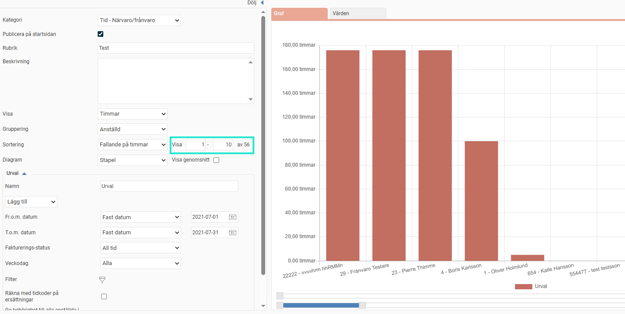 I sorteringen kan du även välja vilka resultat du vill visa. Detta är praktiskt om du får många resultat. Om du till exempel väljer att visa närvarotid per anställd kan du sortera den fallande på timmar och sedan välja att visa 1–10 för att se de tio anställda med högst närvarotid. Här kan du också se hur många resultat det finns totalt.