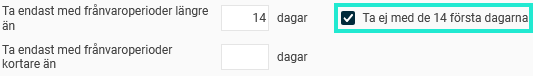 Markerar du inställningen Ta ej med de första 14 dagarna till höger innebär det i en frånvaroperiod på 30 dagar, att de 14 första dagarna inte räknas med utan endast de 16 sista dagarna.