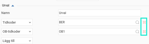 Urval på tidkoder och konteringar lägger du till genom att välja önskat alternativ i urvalslistan under Lägg till. Om du gör urval på någon tidkod och/eller kontering, kommer endast tid rapporterad på denna/dessa att räknas med. Görs inget urval kommer samtliga tidkoder/konteringar att räknas med. Om du vill ta bort ett urval du lagt till gör du det genom att klicka på det röda krysset efter urvalet.