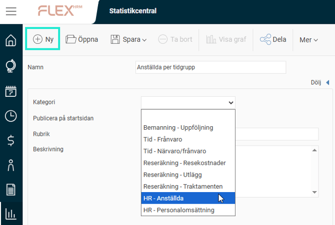 Användaren kommer till en vy där denne kan välja att hämta en sparad statistik eller skapa en ny. När du skapar en ny statistik klickar du på ikonen Ny. Välj därefter kategori, alltså vilken typ av statistik du vill ta fram, exempelvis HR - Anställda.