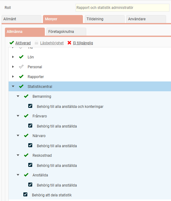 Behörighet till statistikcentralen ställs in under Administration > Användare/Behörigheter > Roller. Där kan du avgöra vilka roller som ska ha tillgång till Statistikcentralen och om de ska få dela statistik, samt se alla anställda oavsett övriga behörigheter. Ett exempel kan vara att man vill ge chefer behörighet att jämföra sin avdelnings frånvaro med hela företaget. Om inte inställningen Behörig till alla anställda markeras kommer endast frånvaro för anställda som du är behörig till i tidrapporten genereras (även läsbehörig). Motsvarande för bemanning betyder att endast anställda och konteringar användaren är behörig att bemanna kommer att räknas med.