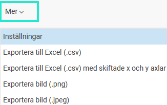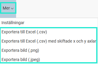 Under menyn Mer kan du exportera data och graf från statistikcentralen. Datan exporteras i CSV-format som går att öppna i t.ex. Excel och grafen som en bild i något av formaten PNG eller JPEG.