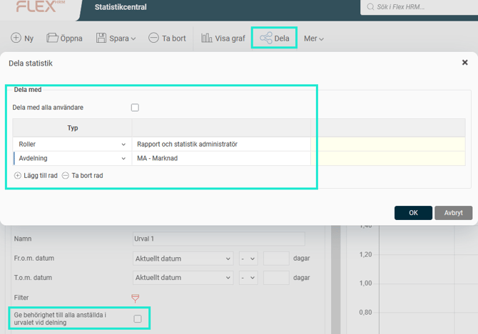 Om inställningen Ge behörighet till alla anställda och projekt i urvalet vid delning är markerad på ett urval när du delar en statistik, innebär det att den du delar till kommer att se exempelvis frånvaro för alla anställda i det urvalet oavsett vad denne har för behörighet. Det kan vara användbart om du vill dela en statistik till chefer som inte är behöriga till alla anställda men ändå vill kunna jämföra sin avdelnings frånvaro med totalen för hela företaget.
