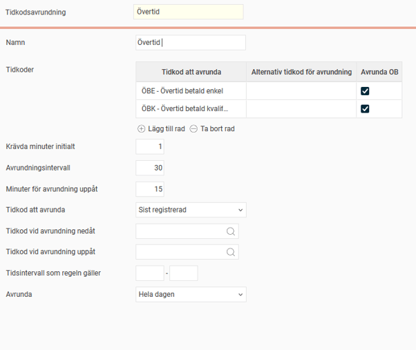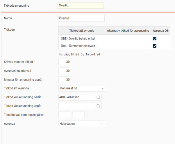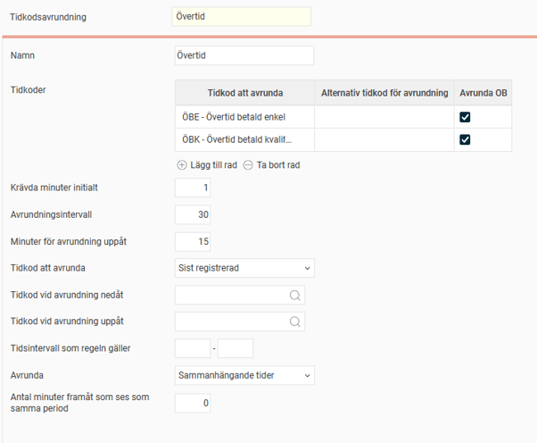 Om man avrundar uppåt, t.ex. 15 minuter arbetad övertid blir 30 minuter, kan justeringen läggas till en tidkod.