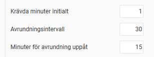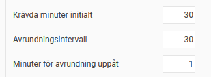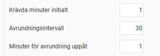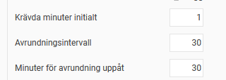 1: På bilden nedan är krävda minuter initialt inställt på 1, avrundningsintervall 30 och minuter för avrundning uppåt 1. Det innebär att redan första minuten registrerad tid avrundas upp till 30 minuter. Varje påbörjad halvtimme avrundas uppåt till närmaste halvtimme.