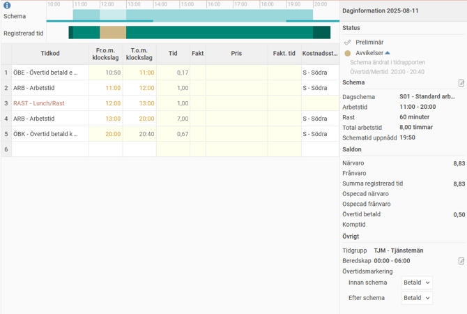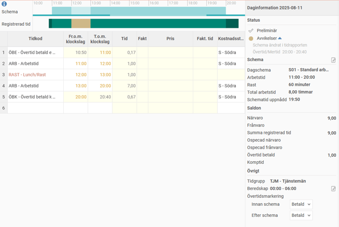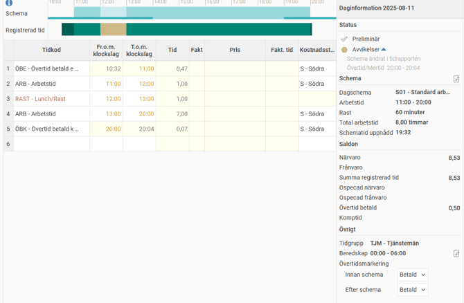 I tidrapporten registreras 10 minuter ÖBE före arbetstid och 40 minuter ÖBK efter arbetstid.