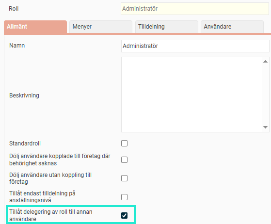 Endast de roller där inställningen "Tillåt delegering av roll till annan användare" är aktiv kan delegeras av användarna.