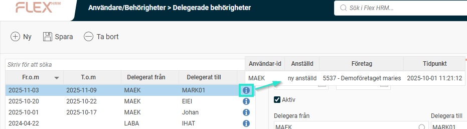 I listan ser du aktuella delegeringar, vem som delegerat, vem som fått delegeringen och under vilken period. Håll muspekaren över i-symbolen för att se vem som skapade eller senast ändrade delegeringen.