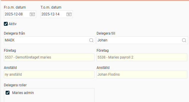 För att skapa en ny delegering, ange ett Fr.o.m. datum och ett T.o.m. datum. Om du lämnar T.o.m. datum tomt fortsätter delegeringen tills den tas bort manuellt.