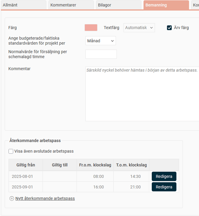 Fliken Bemanning visas för den konteringsdimension som ni har ställt in ska användas för bemanning i systemet. Här kan du skapa arbetspass och bestämma vilken färg de ska ha i bemanningsöversikten.