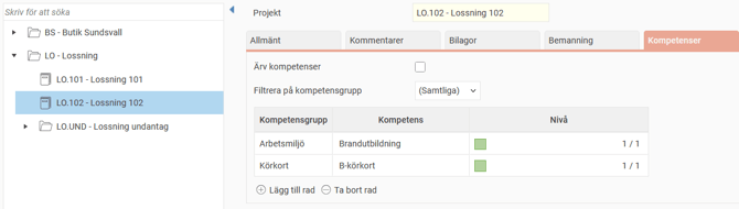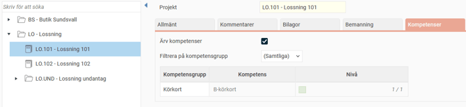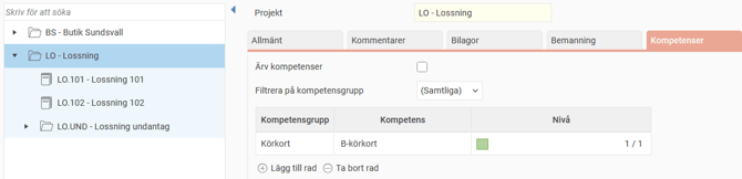 Om du till exempel vill att alla projekt under projekt LO ska ha samma kompetenser, väljer du dessa under huvudprojektet LO. Alla nya underprojekt som skapas under LO kommer då automatiskt att ha Ärv kompetenser markerad som standard.