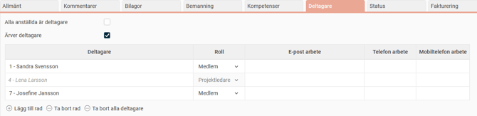 Fliken Deltagare kan du använda för att specificera vilka anställda som arbetar med ett visst projekt.