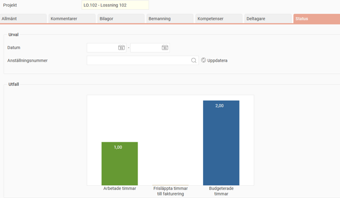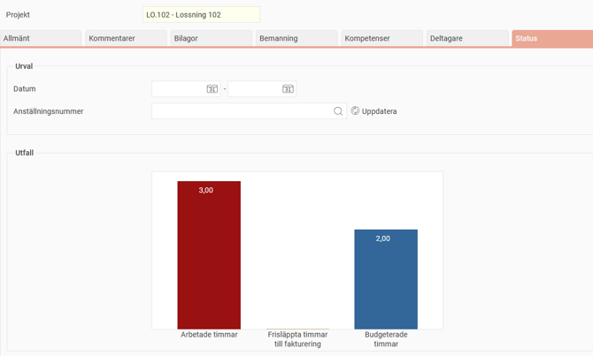 Fliken Status visar hur mycket tid som har arbetats jämfört med den budgeterade tiden i projektet. Informationen visas med hjälp av staplar.