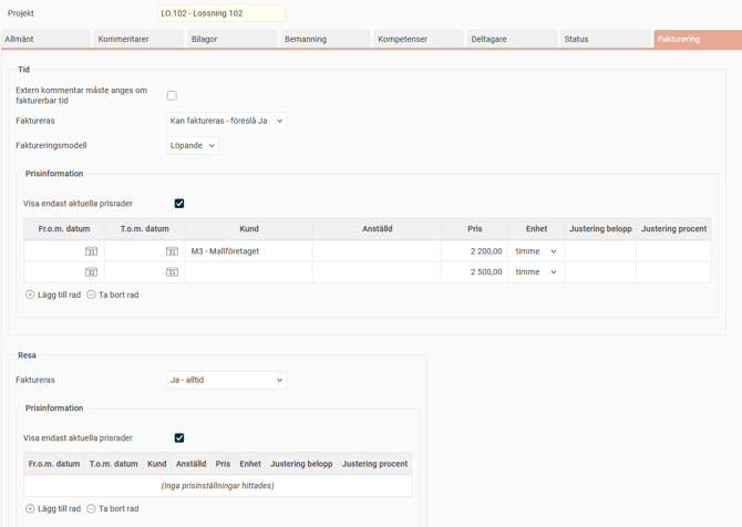 Exempel: För projektet nedan är timpriset 2500 kr/timme, förutom om kund M3 angivits. I det fallet ska timpriset vara 2200 kr.