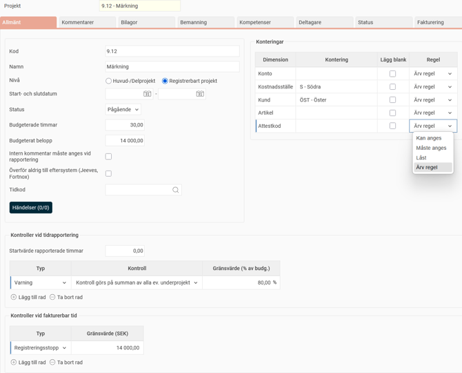 | Kontroll | Kontrollen ärvs ned till alla underprojekt om den läggs på ett huvudprojekt. – Om kontrollen läggs på ett huvudprojekt räknas registrerad tid ihop från alla underprojekt och jämförs med summan av budgeterade timmar för alla underprojekt. – Om kontrollen läggs på lägsta nivån (underprojekt) är det bara den tid som rapporterats på just det projektet som räknas. |