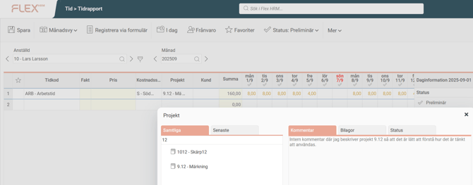 En intern kommentar är text du matar in som endast är synlig internt. Den visas när du söker efter konteringar i olika funktioner i programmet där en kontering ska anges. Exemplet på bilden nedan visar tidrapporten, fältet Projekt.