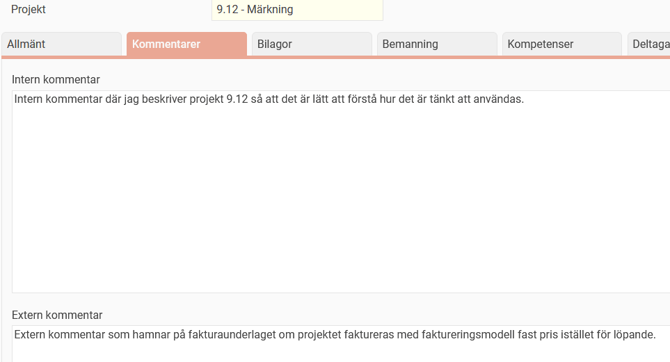 En extern kommentar är text som är avsedd att visas externt. Den följer med till fakturaunderlaget när projektet frisläpps till fakturering, men endast om ett fast pris finns angivet på projektet fliken Fakturering).