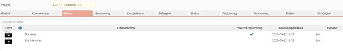 Om du inte bockar i Visa vid registrering syns bilagorna endast under Register > Projekt.