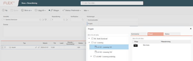 Bilden nedan visar projekt LO.101 som har två bilagor. Båda visas i projektregistret, men i reseräkningen visas endast en bilaga, den som har Visa vid registrering inställt.