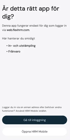 Du som endast vill använda en app för att stämpla in och ut och/eller för att registrera frånvaro kan använda den nya appen. Har du behov av fler funktioner behöver du fortsätta använda HRM Mobile ett tag till.