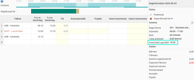 Vad betyder det när det i min tidrapport står till exempel “Schematid uppnådd: 17:15”?