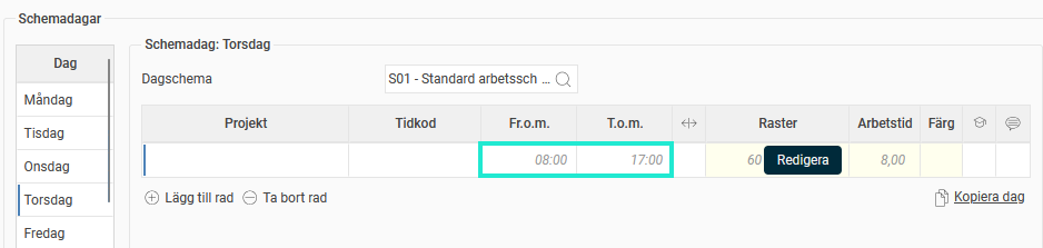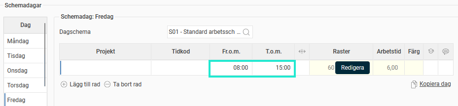 På fredagar arbetar hen 08:00–15:00. Istället för att skapa ett separat dagschema valde man att använda S01 i det personliga schemat, men manuellt ändra arbetstiden på fredagar till 08:00–15:00.
