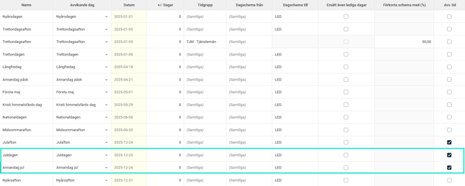 På Juldagen och Annandag jul ska dagschemat bytas till LED (Ledig dag).