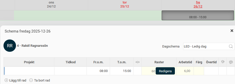 Eftersom Avv. tid är ibockat får hen dagschemat LED med den manuellt angivna arbetstiden 08:00–15:00.