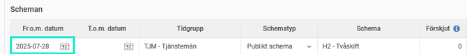 Det publika schemat H2 (bilden ovan) har ett schema med en schemalängd på 14 dagar. Måndag - fredag vecka 1 ska man arbeta kl 08:00-17:00, vecka 2 är schemat kl 14:00-23:00. Att schemastartdatum är satt till 2025-07-21 innebär att schemats vecka 1 infaller samma vecka som 2025-07-21, och rullar på utifrån det.