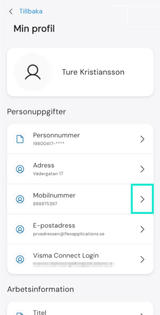 Under Min profil ser du den e-postadress som du använder för att logga in i Flex HRM (Visma Connect Login). Du ser även följande information som är hämtad från anställdaregistret: