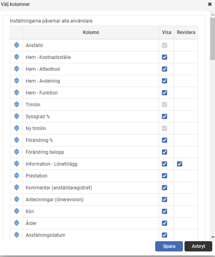 De kolumner du väljer här visas för alla användare som arbetar i just den här lönerevisionen. Tanken är att du som administratör bestämmer vilken information de lönesättande cheferna ska se, så att alla får en så rättvis bild som möjligt.