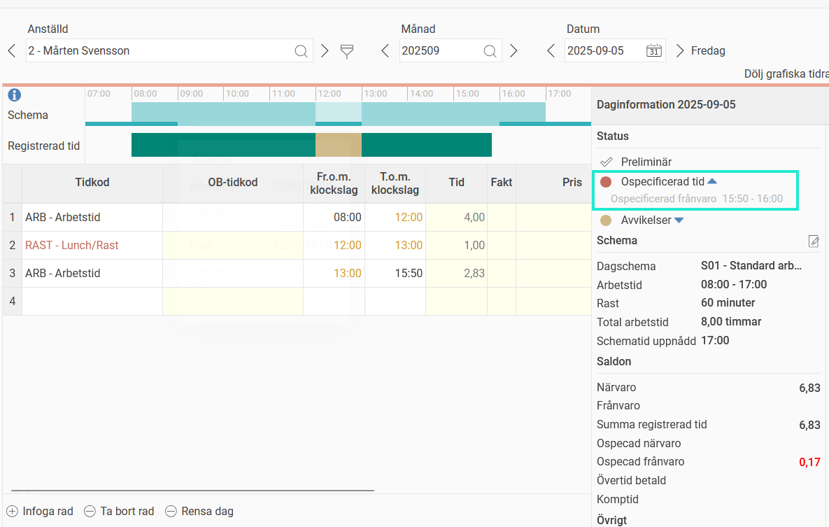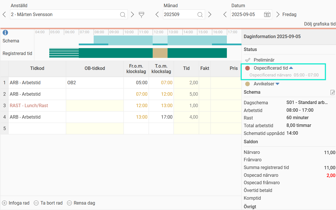 Om din tidrapport visar att du har stämplat in redan klockan 05:00 men inte har markerat tiden mellan 05:00–07:00 som övertid, kommer dessa två timmar att visas som ospecificerad närvaro.