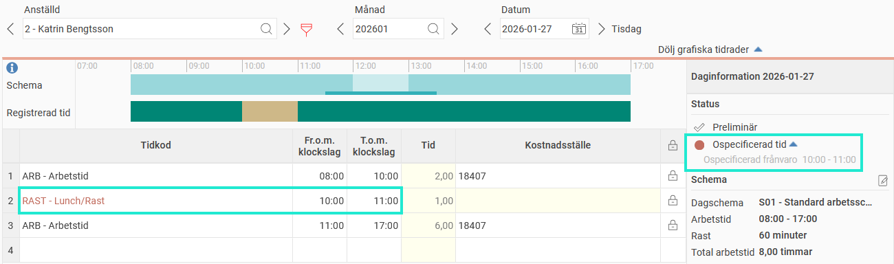 Om du registrerar rast på en annan tid än vad schemat anger, kan systemet markera detta som ospecificerad frånvaro. Det finns dock flera anledningar till att denna markering ibland uteblir.